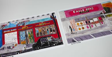 Simon Nicholls is a member of Little Orange Studio at Campbelltown Arts Centre. His works explore a range of nostalgic themes, including old video rental stores, sunset scenes of pizza joints and fairies in suburban gardens.
